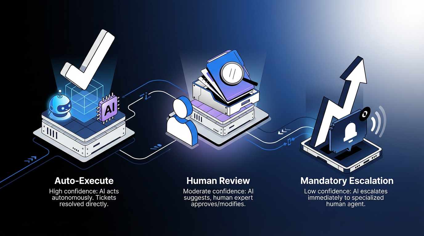 Configure confidence thresholds for each workflow step rather than using a single enterprise-wide policy. High-confidence actions can execute automatically with full audit logging, medium-confidence actions should require human review, and low-confidence actions should trigger mandatory escalation.