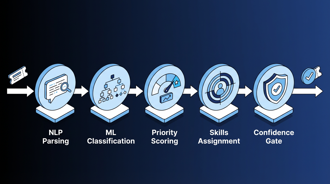 - NLP parsing: Extracts structured meaning from the vague, misspelled descriptions users actually type. Device names, error codes, and urgency signals become structured fields that feed the classification model.
