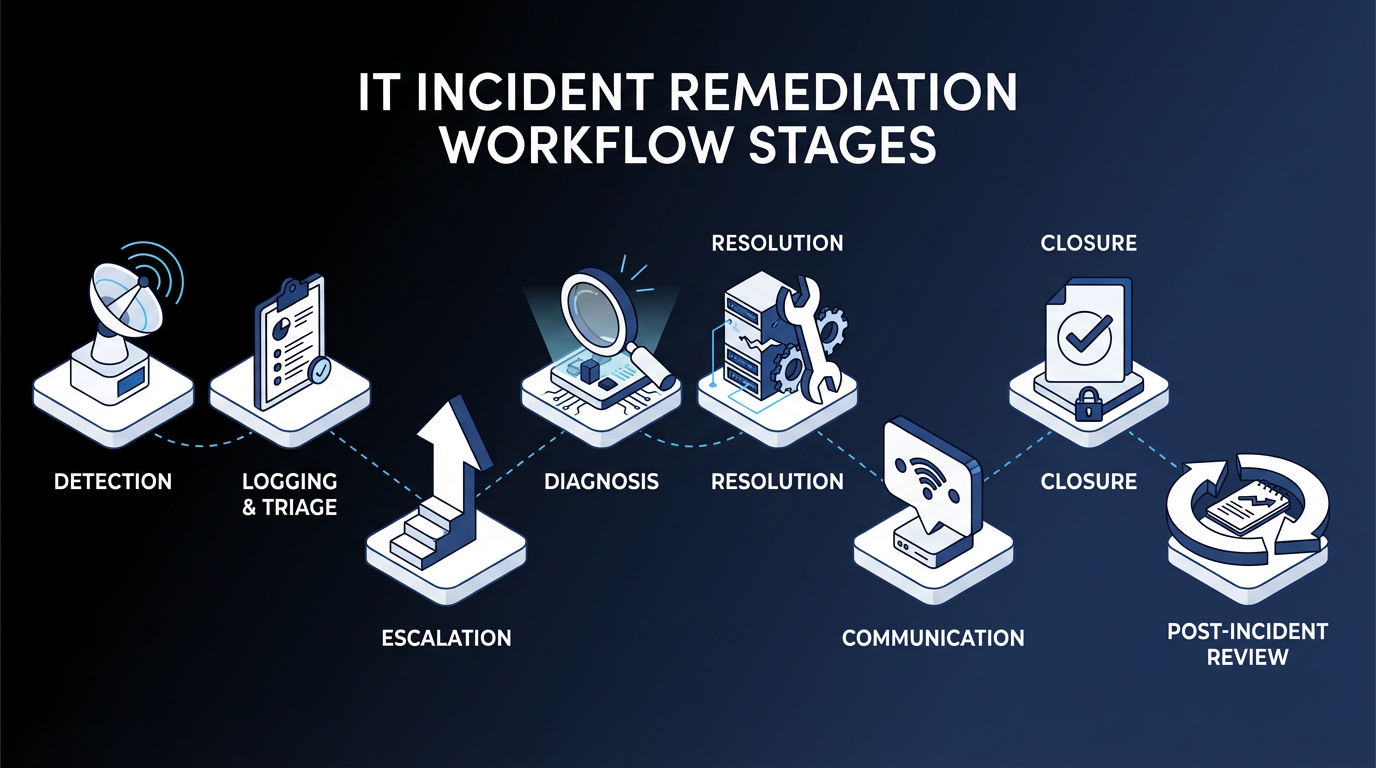 An IT issue remediation workflow is the structured sequence of activities that govern how an organization detects, responds to, resolves, and learns from service disruptions. At enterprise scale, these workflows span multiple support tiers, technology domains, and organizational boundaries.